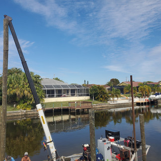 The workers installed the boat lift in several sections, first bringing a barge down the canal that had a mechanism that drove the pilings into the ground: