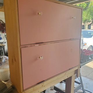 I had to fill a hole where we drilled in the wrong place for a knob, so that's drying, will get sanded and painted, then it'll be ready to attach to the wall. The cabinet only has two from legs, the back is attached to the wall so it takes up as little space as possible.