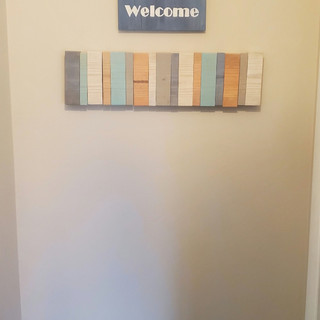 Then moved to the entry way and hung the "welcome" picture mom and I made last summer, along with the coat rack Scott and I made. The coat rack is unique because when its not in use you can push all the "hooks" up, making it look like wall art.